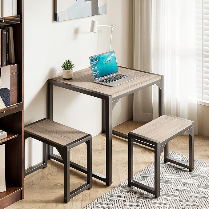 Gizoon Dining Table Set for 2, Kitchen Table Set for 2 with Steel Frame, Kitchen Table with 2 Benches for Small Space, Space Saving Design for Restaurant, Living Room, Grey