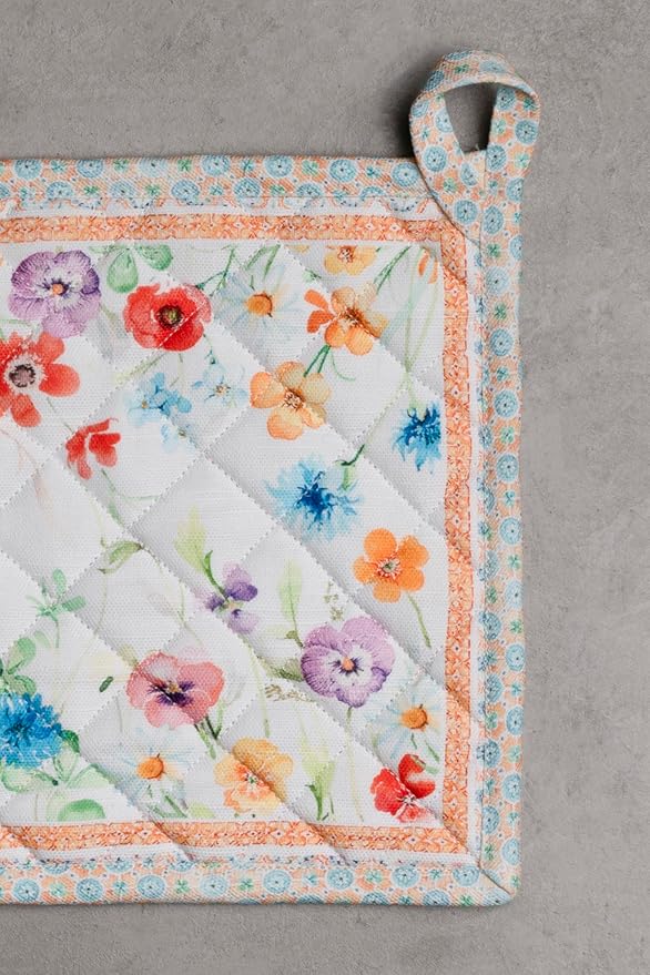 - Package includes: 2 pot holders measures 8"x8". Ideal as a hot pad for dishes, coffee pots, cast iron pans, or cookware. Designed in Europe and Made in India, it blends style, function, and comfort into a daily kitchen essential