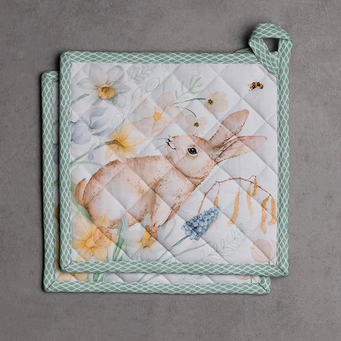 Maison d' Hermine Pot Holders Set 100% Cotton Heat Resistant Potholders 8" x 8" Hot Pads with Loop BBQ, Cooking, Baking, Grilling, Kitchen, Handling Hot Pans Spring/Summer (Pack of 2, Easter Dew)