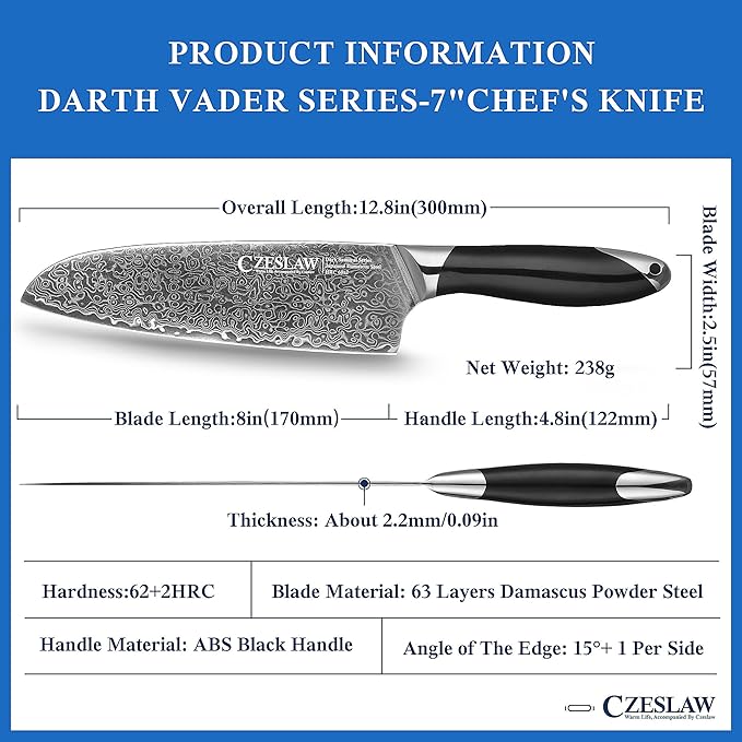- 【Damascus Chef Knife】: Czeslaw chef's knives Made of Japanese Damascus steel, blade has a Damascus raindrop pattern. Chef Knife are a collection of precision-forged, ultra-sharp, and wear-resistant knives with godlike performance that will withstand the test of time. Crafted of premium materials with a look and feel that can only be described as divine, you’ll reach for these sublimely designed knives time and time again.