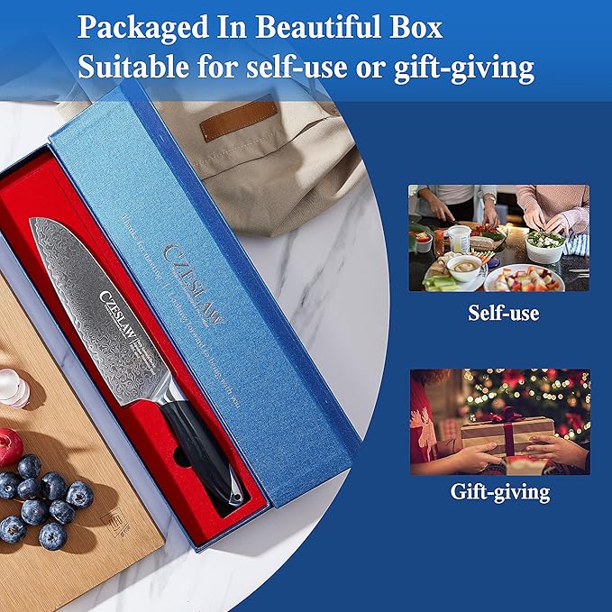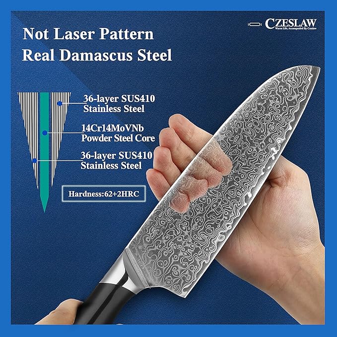 - 【Razor Sharp Edge】: Czeslaw Chef Knife is crafted from Japanese Damascus steel, enhanced with a blend of rare elements. Utilizing cutting-edge steel forging technology, it achieves enduring sharpness, it also enhances and enhances resistance to rust and corrosion. With a Rockwell hardness of 62 ± 2 HRC, this chef's knives makes meal preparations a breeze.