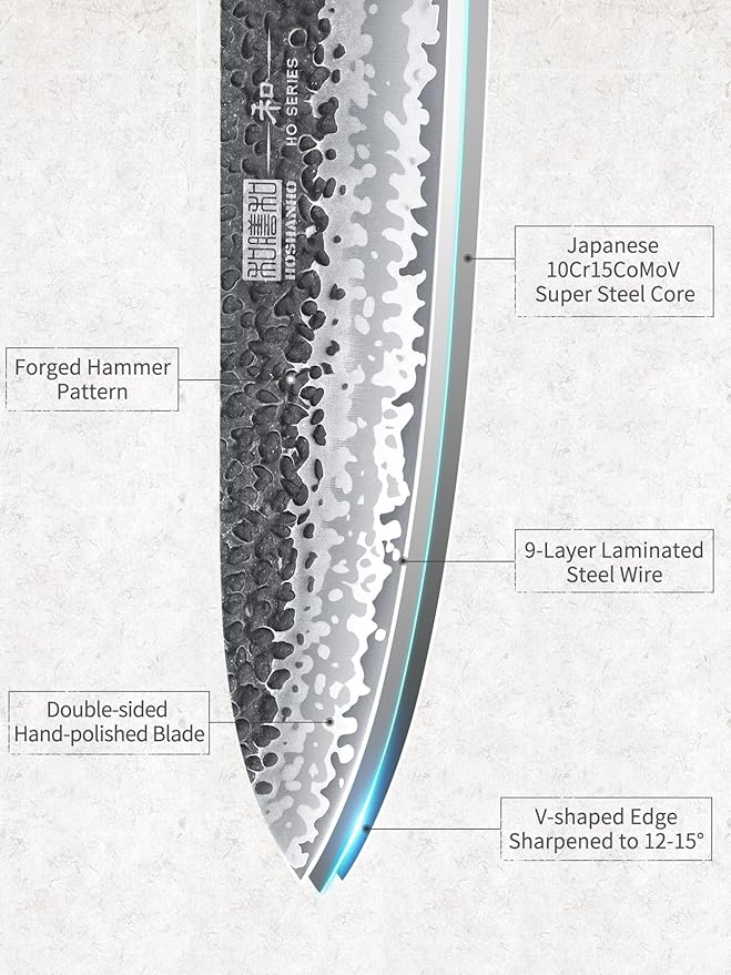 - 【Japanese High Carbon Steel Core】9 layers of high carbon steel forged, steel core is made of high hardness Japan 10Cr15CoMoV super steel, the outside 8 layers of corrosion-resistant and rust-proof composite steel wrapped around the steel core to form a stable sandwich structure for longer service life