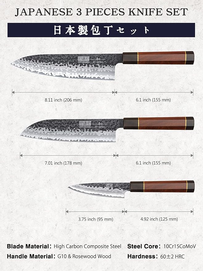- 【Japanese High Quality Steel】This chef knife set line is one-piece, hot-drop hammer forged, which produces the strongest blade from heel to tip; Blades are heat treated and cooled to achieve a rockwell of 60+, possessing great hardness and unparalleled toughness