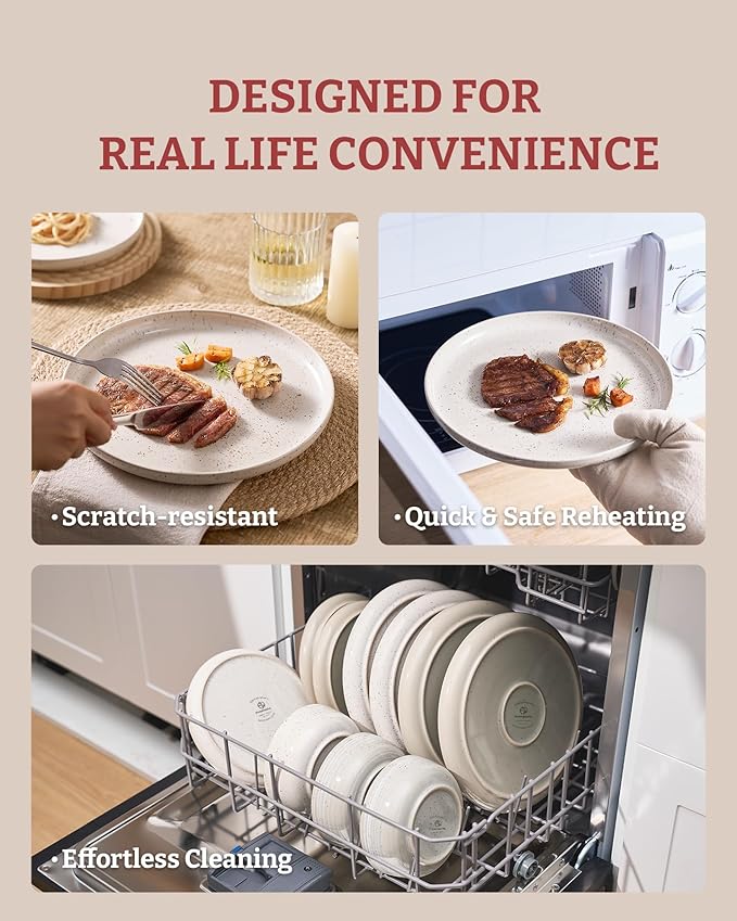 - 【SCRATCH RESISTANT】Our glaze is fired at 2340℉ for 13.5 hours to form a strong scratch resistant surface. No need to worry about scratches from your forks or knives.