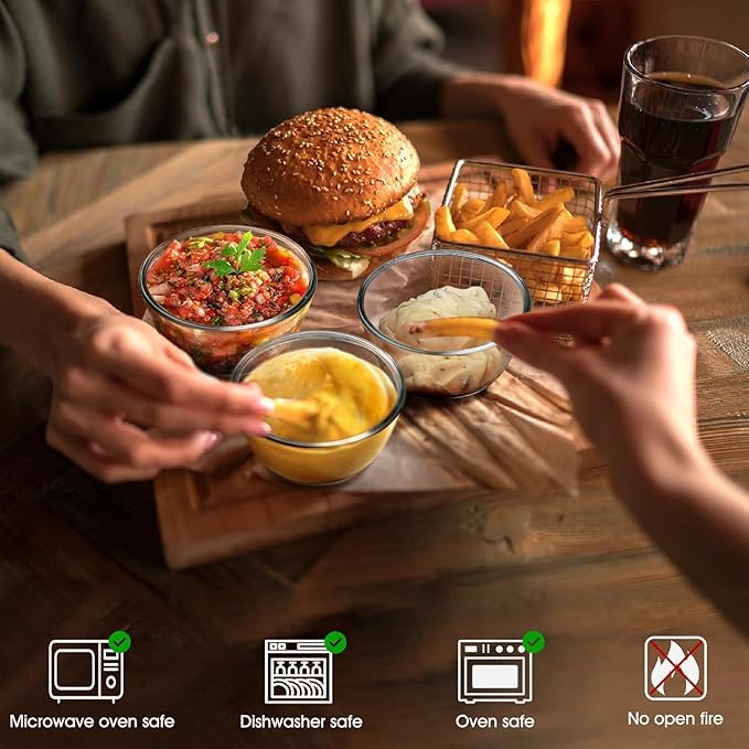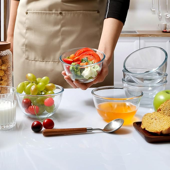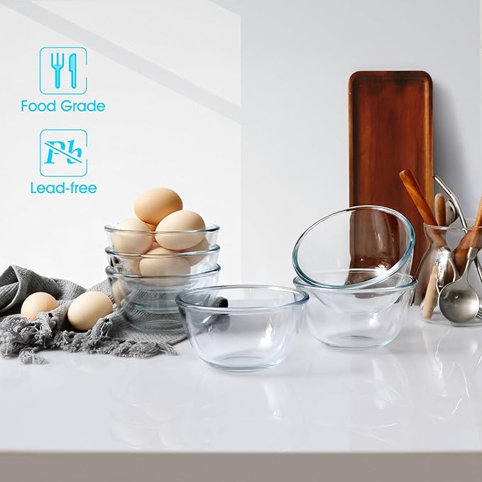 - Versatility in Kitchen: The small glass bowls are perfect for prepping, mixing, serving, storing, marinating, baking and re-heating food in the microwave. Sit nicely stacked and stable in drawer or cupboard.