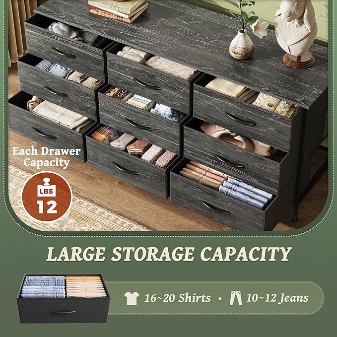 - 【9 Drawer Storage Dresser】 A 47.2 x 11.7 inch wide desktop paired with 9 deep fabric drawers that are 14.8 x 11.7inches. This chest of drawers for the bedroom offers abundant storage. No more hunting around for lost clothes or digging through a mess of clutter. Each drawer's got plenty of space for your media collection, gaming gear, clothes, beddings, and all that good stuff