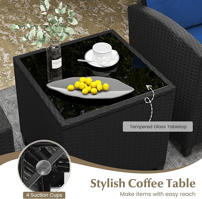 RELAX4LIFE 3-Piece Patio Furniture Set - Wicker Rattan Bistro Sofa w/Glass Top Coffee Table, Washable Cushions for Porch Balcony Backyard Poolside, Outdoor Conversation Set (Navy)