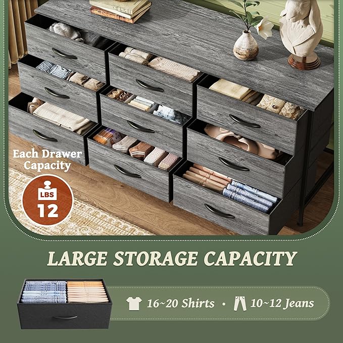 - 【9 Drawer Storage Dresser】 A 47.2 x 11.7 inch wide desktop paired with 9 deep fabric drawers that are 14.8 x 11.7inches. This chest of drawers for the bedroom offers abundant storage. No more hunting around for lost clothes or digging through a mess of clutter. Each drawer's got plenty of space for your media collection, gaming gear, clothes, beddings, and all that good stuff