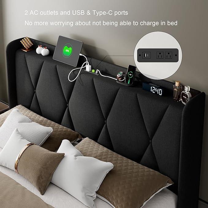 - Charging & Storage Convenience: 2 AC outlets and 1 USB & 1 Type-C port on the headboard, freely charging headphones, tablet, etc. Keeping your phones always online. Besides, 4" storage shelf at the top is easy to put phone, remote control, and other items etc