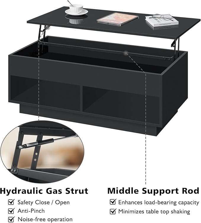 LED Coffee Table Black Lift Top Coffee Table with Storage Modern Tea Table with Hidden Compartment Lift Up Dining Center Table with LED Light for Living Room Home Office