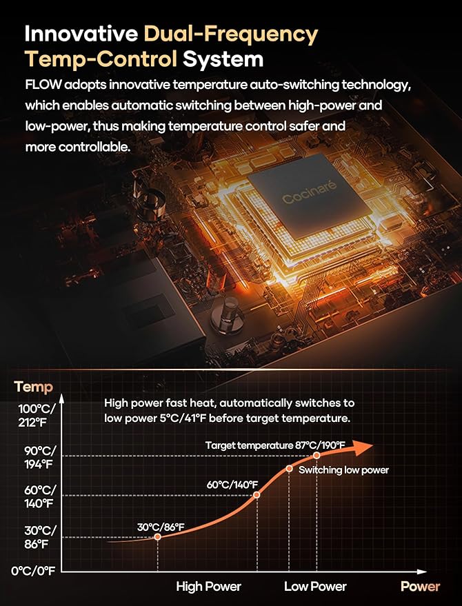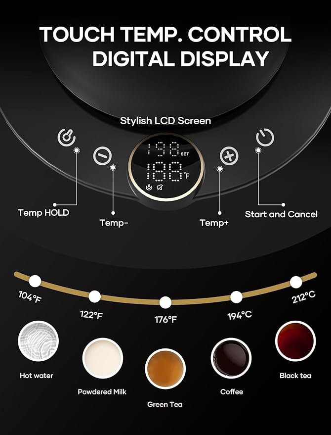 - ±1℉ Temperature Accuracy - The intelligent base's built-in temperature control program. The program will adjust the heating power when the water temp approaches the desired temp according the temp probe detects the temp change.