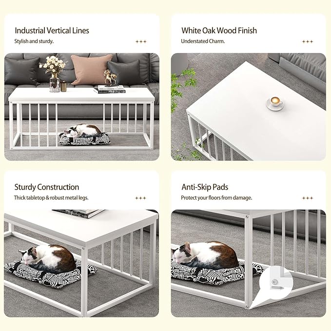 - Open Space for Pets & Storage: The open structure offers ample legroom and a cozy space beneath the white coffee table for pets to rest or play. Vertical metal bars along the sides enhance its unique design while adding a playful touch for cats and dogs