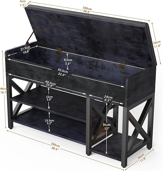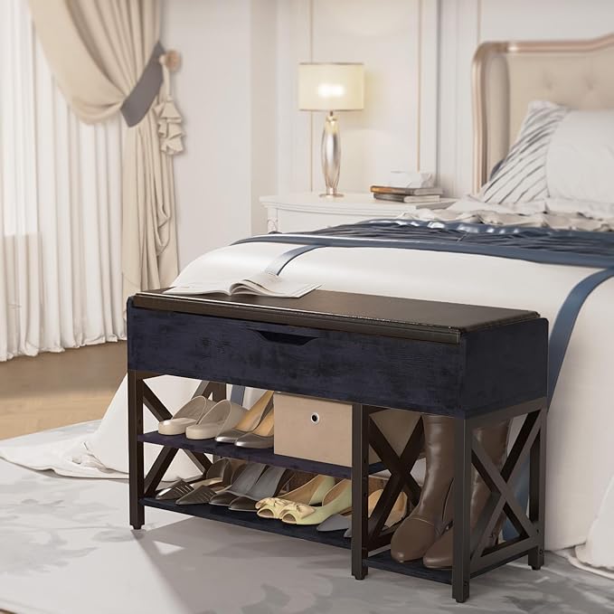 - 【Lift Top Hidden Storage】Shoe storage bench with a lift top storage design provides space for storing small items and protects your entryways from disorder The safe and strong hinges can keeping this storage up so that you don`t have to hold it with your hand ; gently open the cushion can be fixed, sturdy support points to avoid pinching hand.