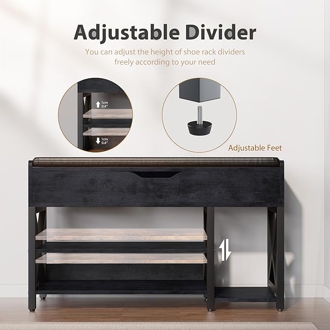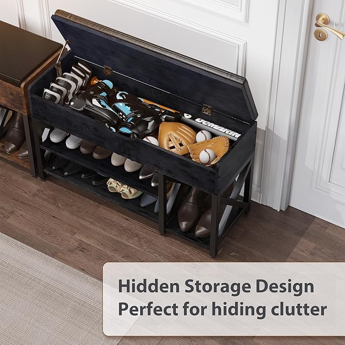 Shoe Bench, Lift Top Shoe Storage Bench, Adjustable Shelf Entryway Bench with Padded Cushion for Entry, Closet, Living Room, Hallway, 2-Tier Shoe Rack Organizer(Black, 39.5“W)