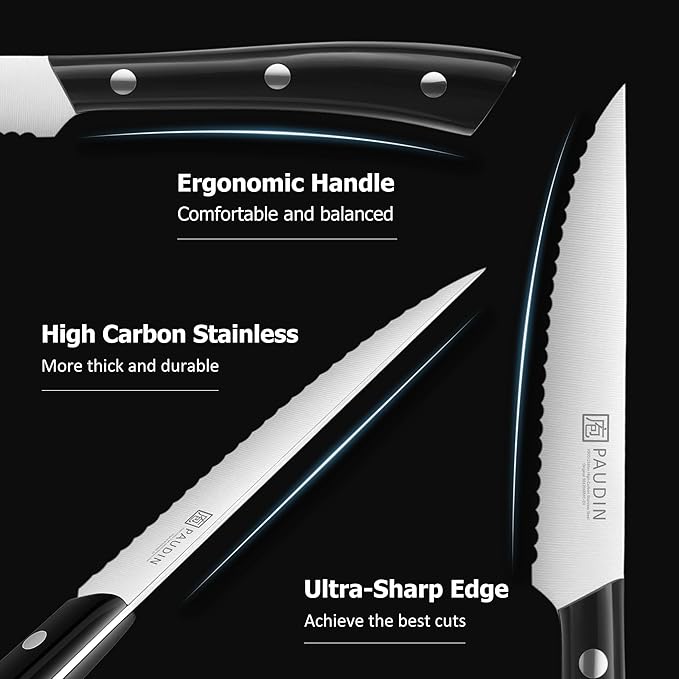 - PROFESSIONAL STEAK KNIFE SET: Designed for steak enthusiasts, this 4.5-inch serrated steak knife ensures effortless, precise cuts every time with minimal sticking. PAUDIN steak knife is perfect for family dinners, gatherings, or any occasion where steak is served.