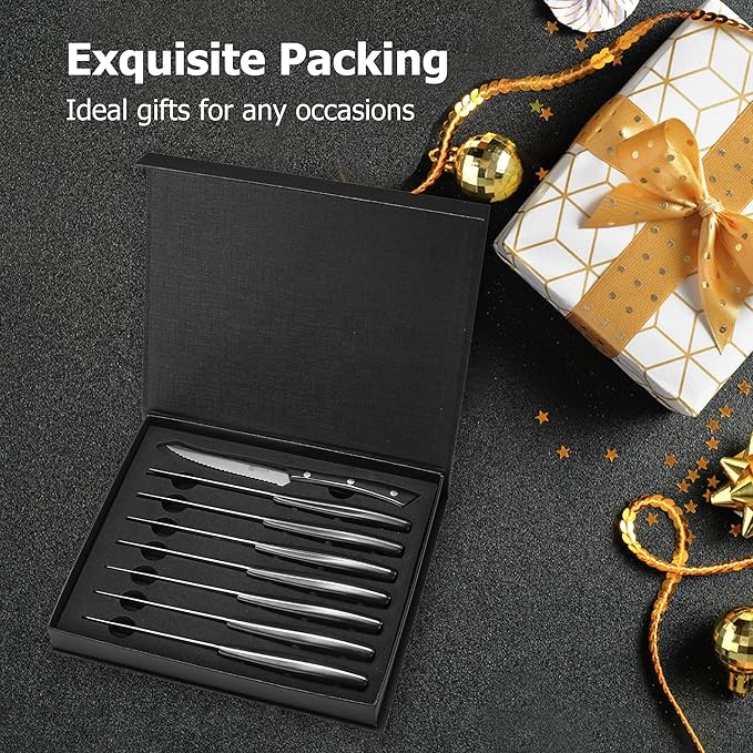 - HIGH-CARBON STAINLESS STEEL: Steak knives set is crafted from stainless steel with a 56+ Rockwell hardness, offering exceptional durability, rust, and corrosion resistance. Perfect for cutting through meat, vegetables, and other kitchen task, without frequent sharpening.