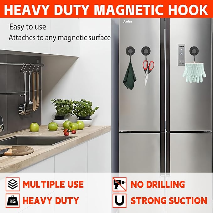 - [Heavy Duyt Magnetic Hook]: Magnetic hooks is easy to remove and install and reusable. It's not limited to just grills and easy to attach to any metal surface. Can be used in kitchen, laundry, office, classroom, garage, bathroom, etc