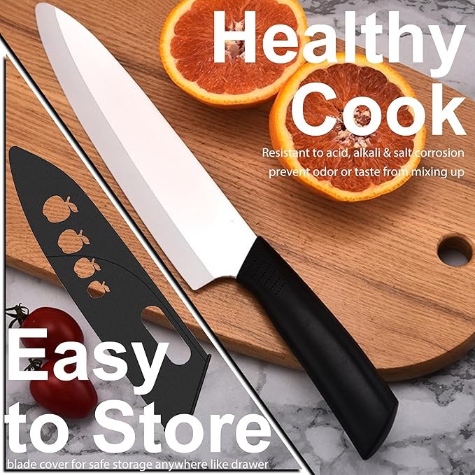 - GIFT GRADE QUALITY CERAMIC KITCHEN KNIFE, finely crafted 6" white ceramic blade with 5" soft black resin handle, 0.06" thin blade, light weight up to 0.22 lbs, with custom fit blade guard and premium gift case