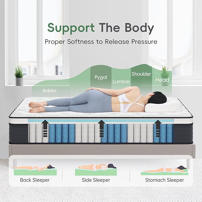 - Reinforced Spring for Better Support - COOLMI hybrid mattress queen is built with high-density memory foam and hundreds of independent pocket springs. A customized support for every curve of your body, ensuring that your weight is evenly distributed from head to toe. This ergonomic design maintains a good balance of your spine and ultimate pressure relief, give a better protection to you and your family.