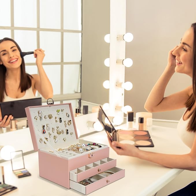 - Pull-out drawer Jewelry Box: The double-layer jewelry drawer offers ample storage space, with hooks, slots and compartments of varying sizes to accommodate a range of jewelry items. Add a stud board to organise your studs