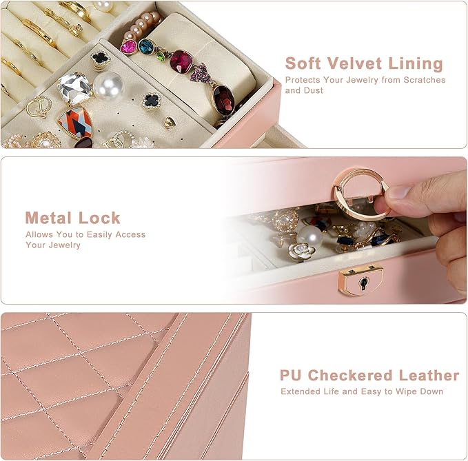 3-Layer Jewelry Box for Women, Jewelry Organizers and Storage with Removable Jewelry Tray, Vintage Quilted Top Lockable Jewelry Holder Gift Idea Pink