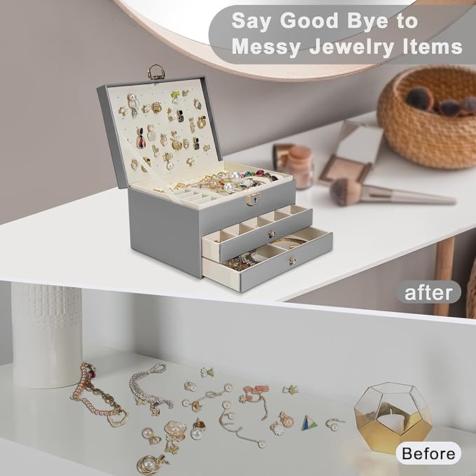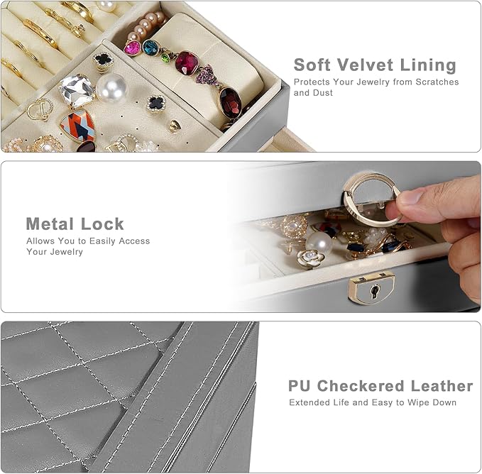3-Layer Jewelry Box for Women, Earing Holder Jewelry Organizers and Storage with Removable Jewelry Tray, Vintage Quilted Top Lockable Jewelry Holder Gift Idea Gray