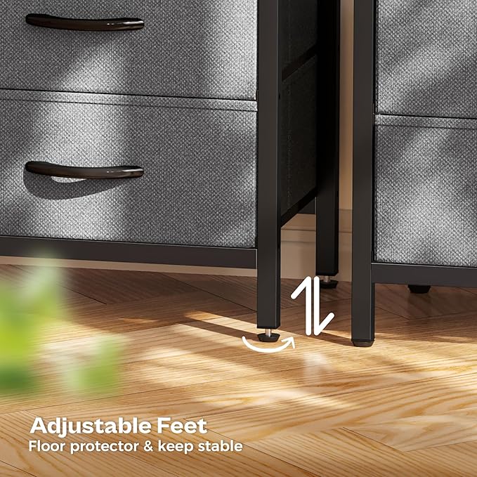 - 【Sturdy and Safe】Crafted with particle board and a robust metal frame, this bedroom dresser with drawers ensures durability and longevity. Secure it to the wall with anti-tip device to prevent items from falling or protect kids when in use. Also, the adjustable feet ensure more stability on the floor and protect against floor scratches