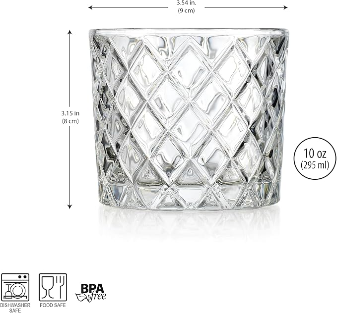 - Elegant Design: These double old fashioned glasses feature a timeless diamond cut pattern for a sophisticated look. Set of four Crystal-look Bar Glasses for parties, guest, and dinner.