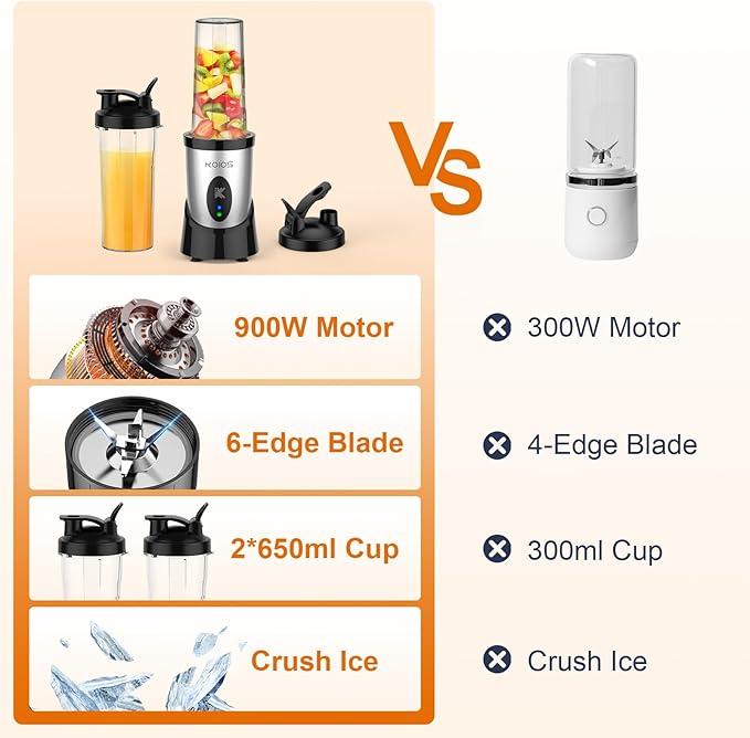KOIOS Smoothie Blender, 900W Personal Blender for Shakes and Smoothies Kitchen with 2 No-BPA 22oz Portable Cups, Single Serve Smoothies Maker Mixer for Juices, Nutritious Recipe, Sliver