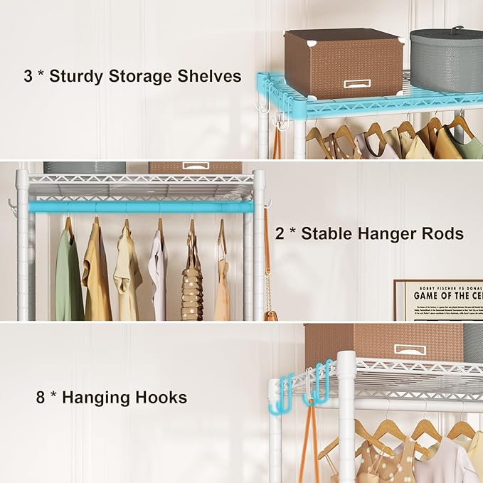 - 【Adjustable Shelves】Freestanding clothing rack features 3-tier adjustable height shelves and double hanging rods. The wire shelves can be adjusted up and down to accommodate various items you need to store, allowing you to easily maximize your storage space for coats, suits, dresses, shoes, hats, etc