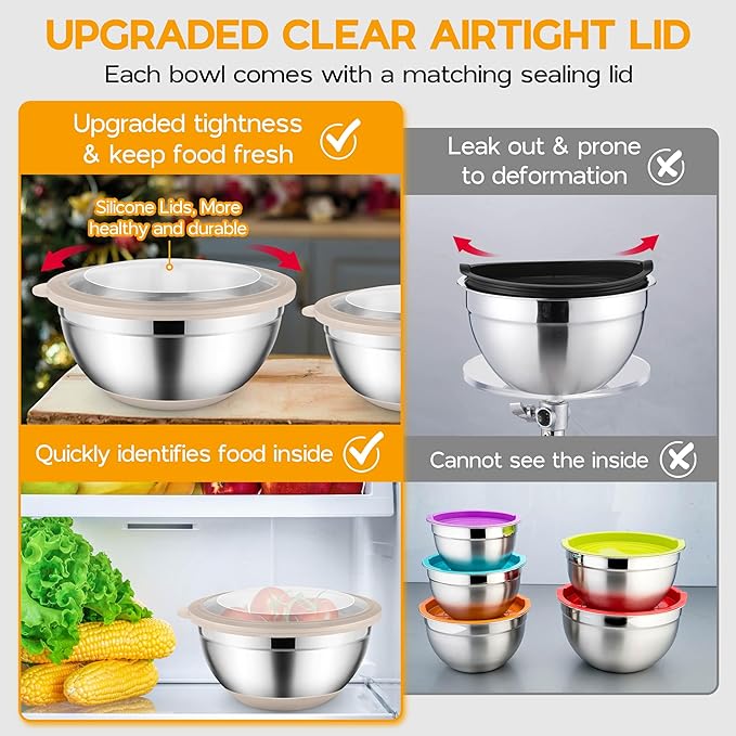 - Healthy & Durable: mixing bowls are made of quality stainless steel to prevent rust, dents and offer reliable durability, transparent lids are crafted of food-grade plastic and silicone for healthy use