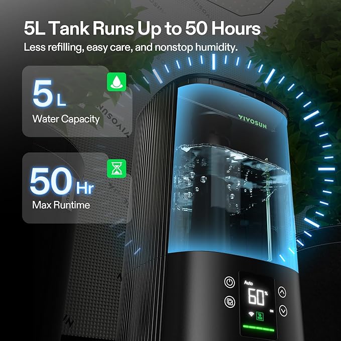 - Easy to Use: Effortlessly customize and maintain optimal humidity with adjustable mist output and intelligent constant humidity settings; The low water alert ensures continuous operation, while the top opening allows for convenient refills