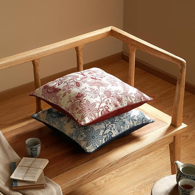 Design Linen Square Throw Pillow Covers 18"x18" Pack of 2, French Country Cushion Covers with Red Toile de Jouy Floral Pattern Decoration Pillowcases for Bed, Living Room, Outdoor, Car