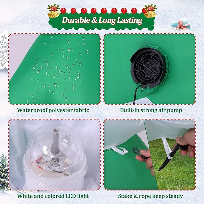 - WEATHER-RESISTANT & LONGER LIFESPAN: This Outdoor Christmas Tree inflatable outdoor is made of durable 210T waterproof umbrella fabric, which is not only very wrinkle-resistant but also not easy to be pierced by sharp and hard objects; The waterproof design ensures it stands strong against snow and wind. Whatโs more, with spraying technology, the vibrant color won't discolor. This makes it the perfect christmas outdoor decoration to your yard, bringing festive cheer to your home year after year.