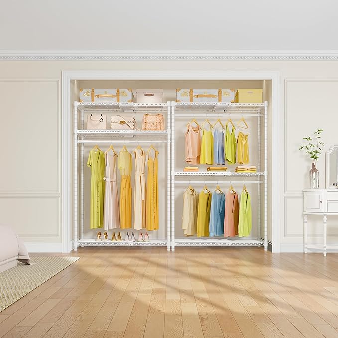 - Multifunctional Garment Rack: The wardrobe rack can be used in multiple types of rooms, suitable for cloakrooms, bedrooms, apartments, school dormitories, and laundry rooms. Shoes can be put on the bottom of the shelf neatly, and clothes can be folded and organized on the shelves