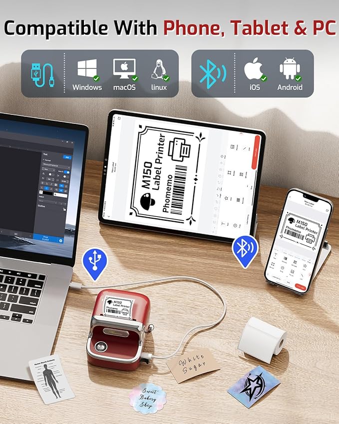 - 【Easy to Connect and Use】Phomemo M150 wireless label maker works with smartphones, tablets running iOS, Android systems and computers running Windows, macOS, or Linux systems. Just download the "Print Master" app on your mobile device and pair it via Bluetooth. For computers, go to phomemo website to get the drivers or "Labelife" app, then connect with a USB cable and print this label machine
