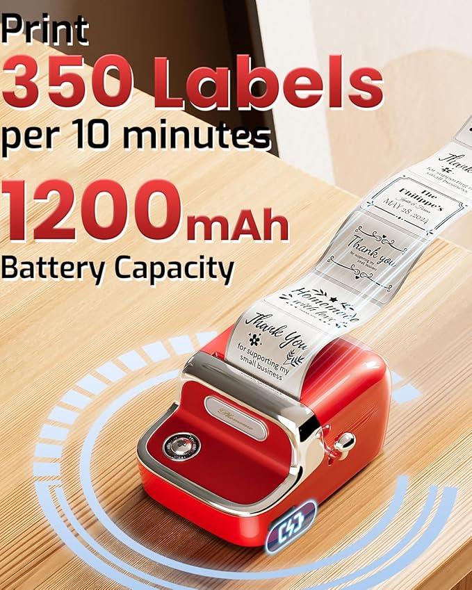 - 【Prints Clearly, Smart Rewind】 Phomemo M150 vintage label maker uses thermal technology, eliminating the need for ink. M150 small label printer is also equipped with an NTC temperature sensor to ensure print clarity is not affected by overheating. Additionally, the M150 label machine features an automatic rewind function for the first label, ensuring every label is fully utilized and waste is avoided