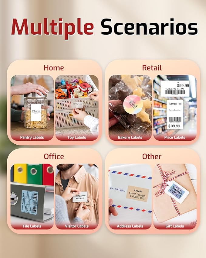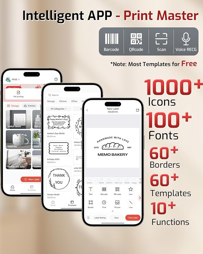 - 【Powerful APP】The "Print Master" app is a versatile tool offering features like barcode and QR code creation, text input, image capture, voice recognition, and printing from PDF and Excel, along with batch printing. It also provides over 400 fonts, 700 templates, and 6000 symbols for label customization