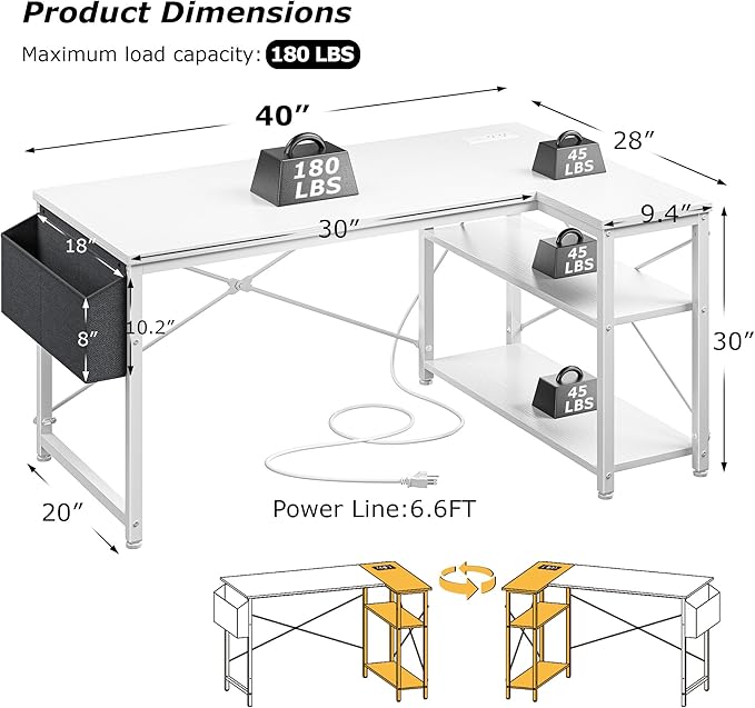 EnHomee Small Computer Desk with Storage Shelves & Side Bag, 40 Inch L Shaped Gaming Desk with Power Outlets, Corner Desk Study Writing Table for Home Office Bedroom Living Room, White
