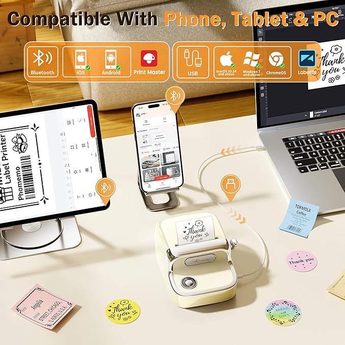 - 【Strong Compatibility】Phomemo M150 wireless address label maker is compatible with smartphones, tablets (iOS and Android systems), and computers (Windows, macOS, Linux). To use it with a smartphone or tablet, download the “Print Master” App from Google Play or App Store, then print by connecting via Bluetooth. For use with a computer, visit the official website to download drivers and the “Labelife” app, then connect and print using a USB data cable
