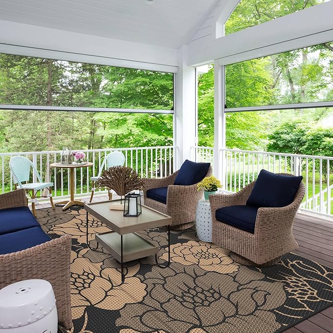 GENIMO Outdoor Rug Waterproof for Patio Decor, 9' x 12' Reversible Plastic Straw Floral Camping Carpet, Large Area Rugs Mats for RV, Camper, Deck, Balcony, Porch, Beach, Picnic, Mix-Black & Brown