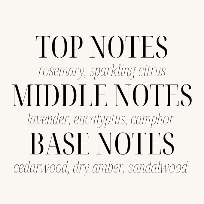 - Top notes - rosemary and sparkling citrus; Middle notes - lavender, eucalyptus and camphor; Base notes - cedarwood, dry amber and sandalwood