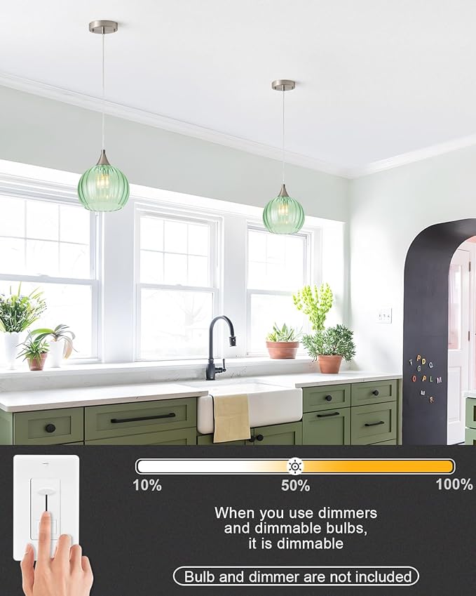 Brushed Nickel Pendant Lights Kitchen Island, Globe Pendant Light Fixtures with 8 Inch Clear Glass Shade, Modern Hanging Light Fixtures for Kitchen, Bedroom (1 Pack - Green Glass Pendant Light)