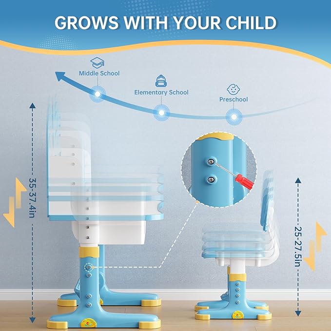 - 【Designed for Growing Minds】Xaperexi study tables are adjustable and ergonomic, making it easy to change the height of the desk and chair to match your child’s size, ensuring long-term use as they grow. The kid’s study chair is ideal for children ages 3-15.