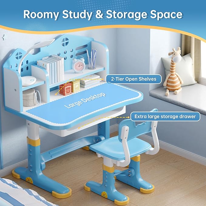 - 【Functional Study Desk Design】Xaperexi kids desk set includes a built-in bookstand and storage drawer for keeping books, stationery, and other essentials organized. With a spacious, widened desktop, it’s ideal for both boys and girls to write, draw, and study comfortably. The functional design makes it a great addition to any home or school environment, offering long-lasting durability and comfort.