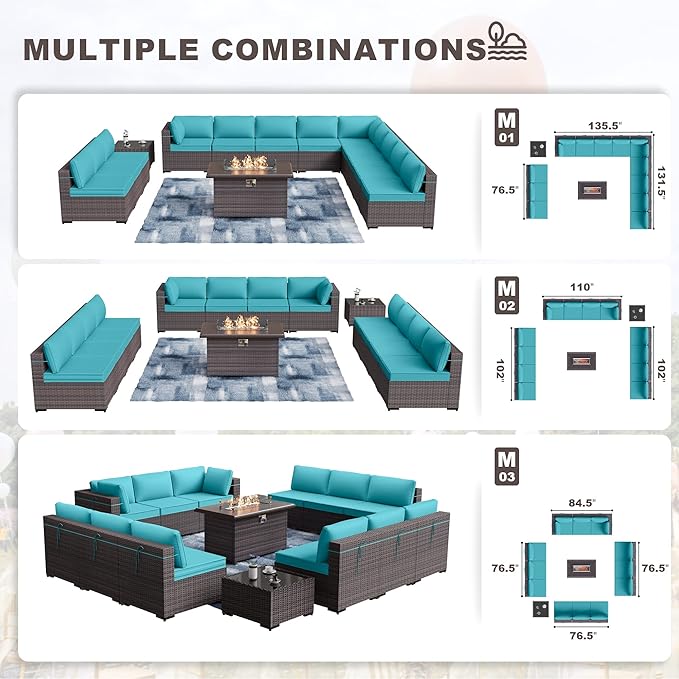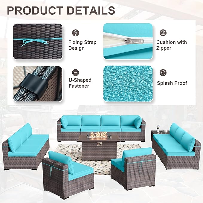 Kurapika 14 Pieces Patio Furniture Set, Rattan Wicker Outdoor Conversation Sets w/43in Propane Fire Pit Table and 4 Inch Cushion(Blue)
