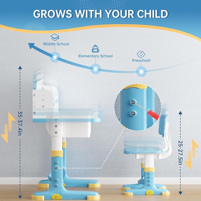 - 【Designed for Growing Minds】Xaperexi study tables are adjustable and ergonomic, making it easy to change the height of the desk and chair to match your child’s size, ensuring long-term use as they grow. The kid’s study chair is ideal for children ages 3-15.