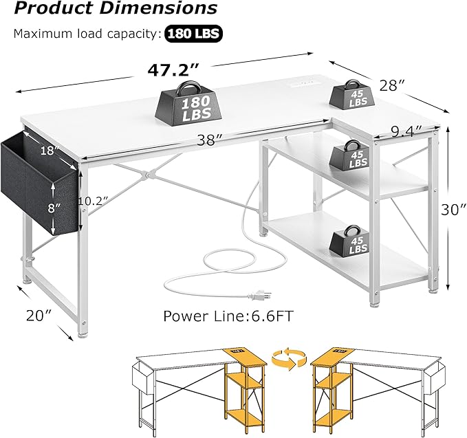 - 【L-Shaped Design for Corner Space】This ergonomic L desk features a 48-inch reversible design, perfect for dual workstations in home offices or gaming setups. The maximum load capacity of the desktop is 180LBS, l shaped deskrt heavy items such as printers and computer tower. The corner desk configuration maximizes space efficiency in any room layout.