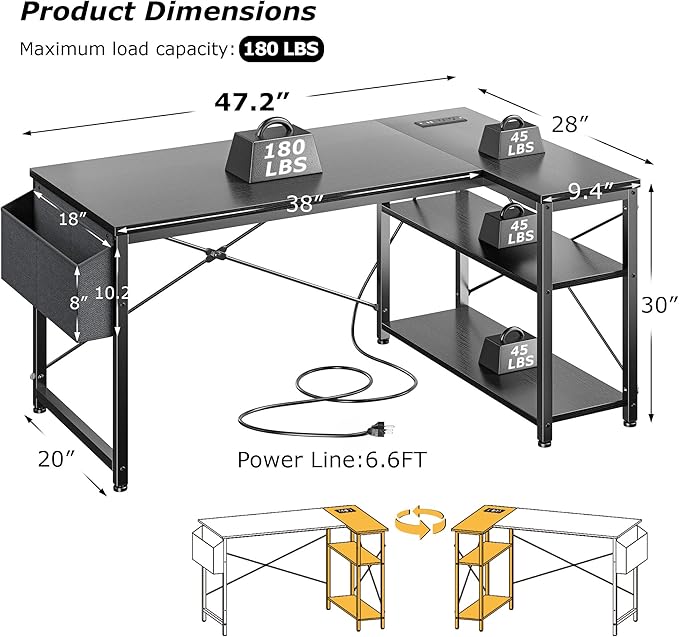 - 【L-Shaped Design for Corner Space】This ergonomic L desk features a 48-inch reversible design, perfect for dual workstations in home offices or gaming setups. The maximum load capacity of the desktop is 180LBS, l shaped deskrt heavy items such as printers and computer tower. The corner desk configuration maximizes space efficiency in any room layout.