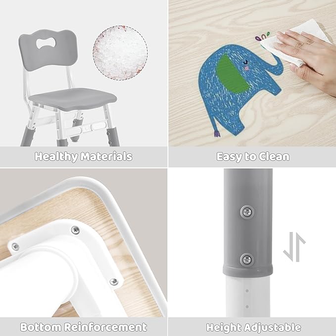 - 1 ✨ 【Height-Adjustable Design】 Table: Features 7 adjustable height levels from 17.7” to 21.65”, accommodating children from ages 3 to 8. Chairs: 4 chairs with 3 adjustable height settings (10.6” to 12.2”) ensure a perfect fit for growing kids.